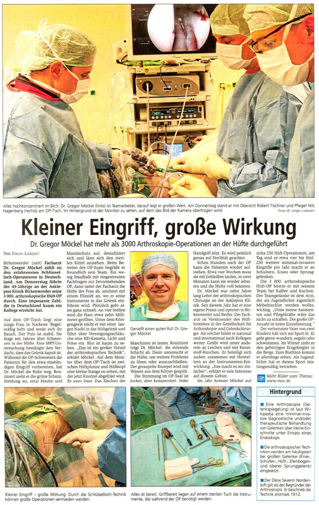 Dr. Gregor Möckel ist seit 2004 als Hüftspezialist insbesondere für minimalinvasive Operationen (Arthroskopien) tätig. Diese Technik hat er in den letzten 20 Jahren maßgeblich mit etabliert. National und international hat er dabei zur Entwicklung der Hüftgelenk erhaltenden arthroskopischen und offenen Chirurgie beigetragen, in Vorträgen, wissenschaftlichen Zeitschriften- und Buchbeiträgen, als Instruktor in Kursen und Workshops, mit der Entwicklung von Operationsinstrumenten und in Live-Operationen. Darüber hinaus war er langjährig als Vorsitzender im Hüftkomitee der AGA aktiv. Sein Schwerpunkt ist die individuelle abgestimmte perfekte Behandlung von Sportverletzungen oder angeborenen Erkrankungen insbesondere des Hüftgelenks wie dem femoroacetabulären Impingement, der Dysplasie sowie die Arthrose des Hüftgelenks. Dr. Gregor Möckel ist Experte für Hüftarthroskopie mit aktuell über 5000 Eingriffen.